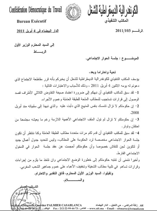 رسالة مكتب الكونفدرالية للوزير الأول في شأن مقاطعة حوار 4 أبريل2011